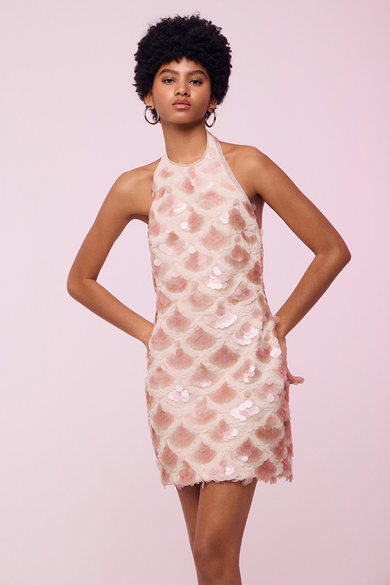 - Κοντό φόρεμα από τούλι με παγιέτες και ανοιχτή πλάτη. Κλείνει με κουμπιά στον αυχένα και κρυφό φερμουάρ στο πίσω μέρος.
