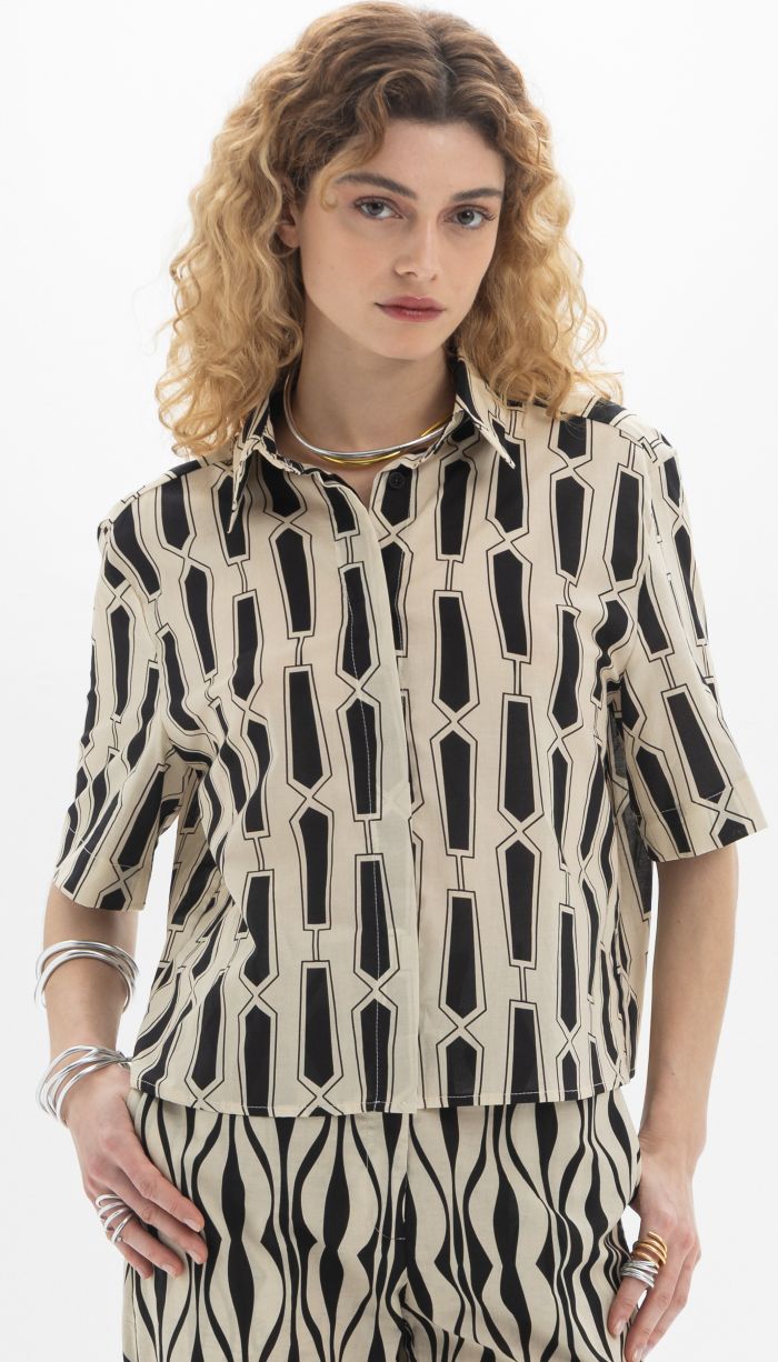 - Διαθέτει μανίκια 3/4 με κουμπωτές μανσέτες και χαμηλή ραφή στους ώμους (dropped shoulders), δίνοντας μια πιο χαλαρή αίσθηση.