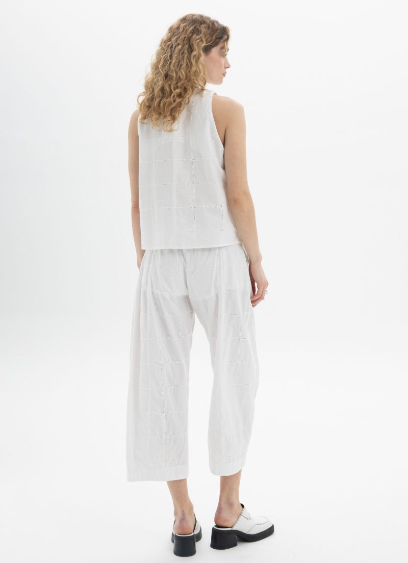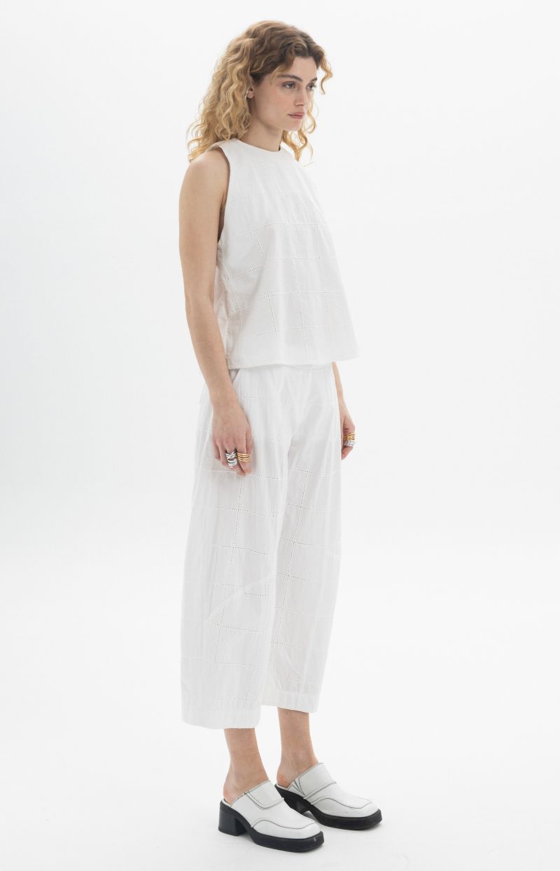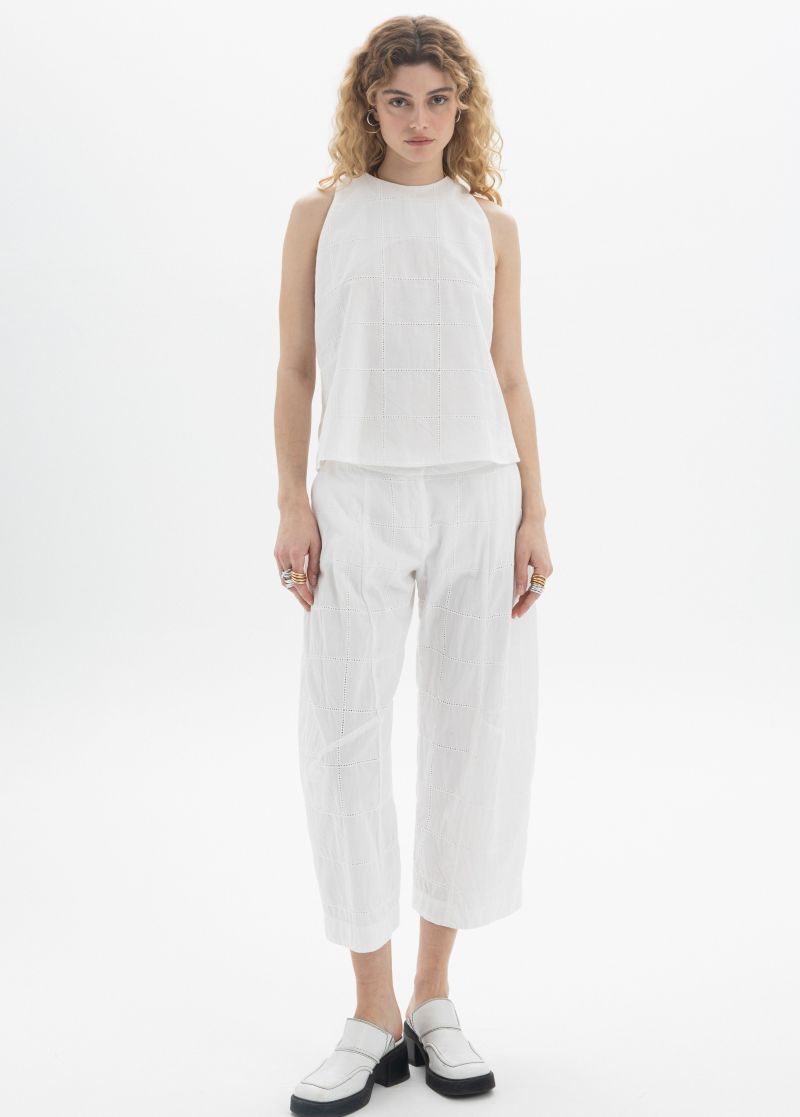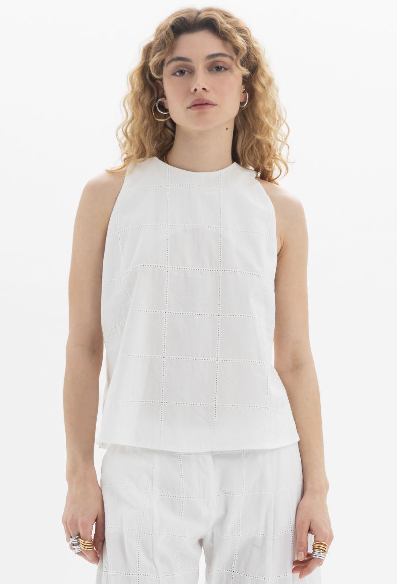 Αμάνικο τοπ με καθαρή ψηλή λαιμόκοψη και διακριτικές ανάγλυφες λεπτομέρειες, σχεδιασμένο σε κανονική, χαλαρή γραμμή για μια μοντέρνα και εκλεπτυσμένη σιλουέτα.