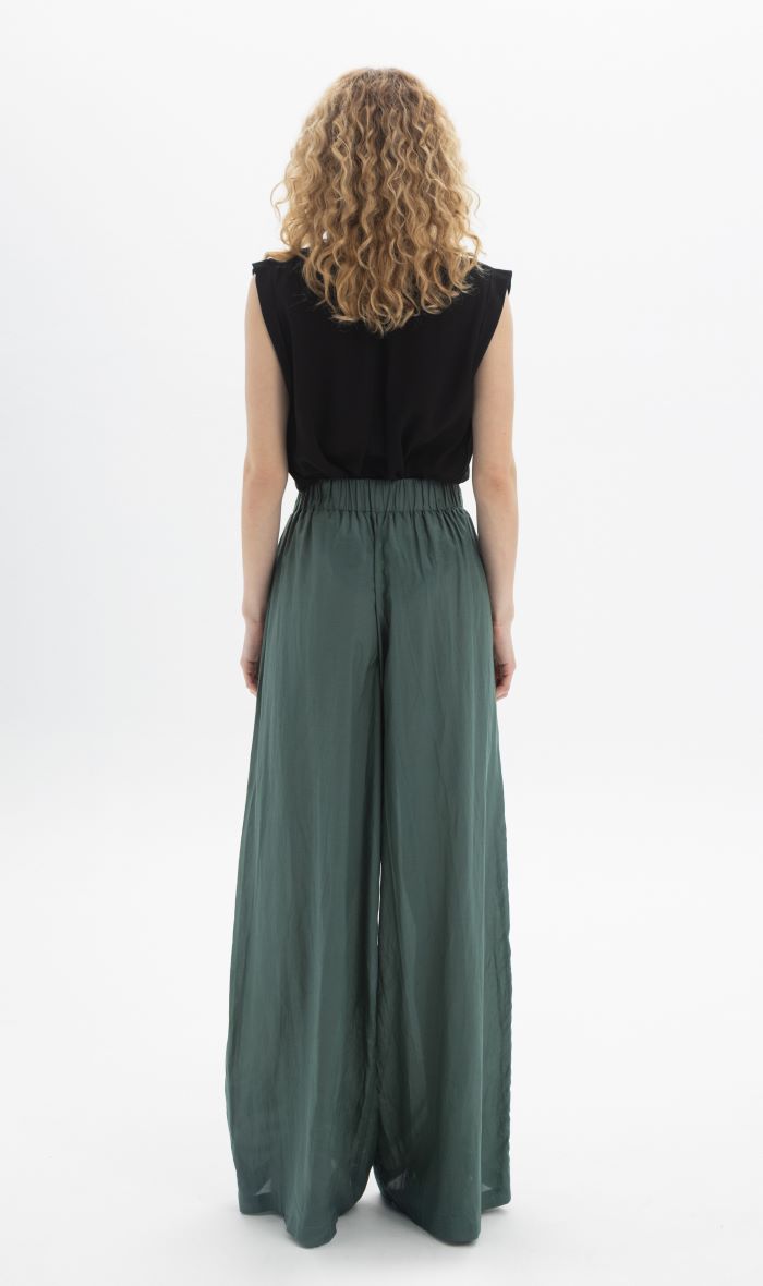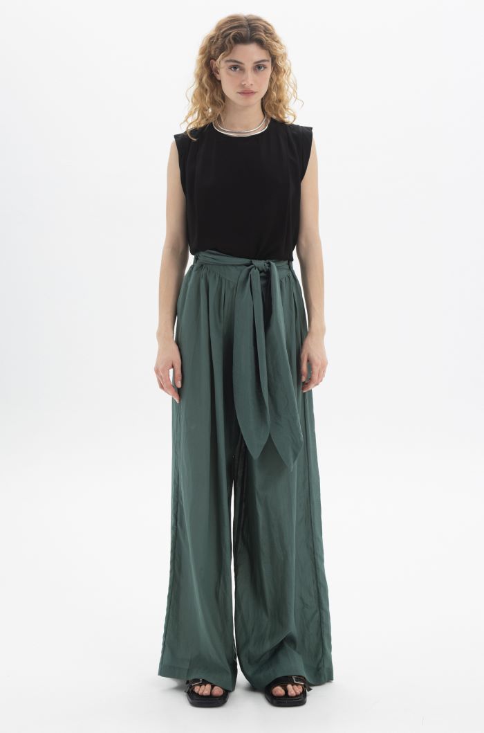 Παντελόνι με ψηλή μέση και φαρδιά γραμμή, ασορτί υφασμάτινη ζώνη και ριχτή δομή, σχεδιασμένο σε φαρδιά, χαλαρή εφαρμογή για αβίαστη κομψότητα και άνεση.