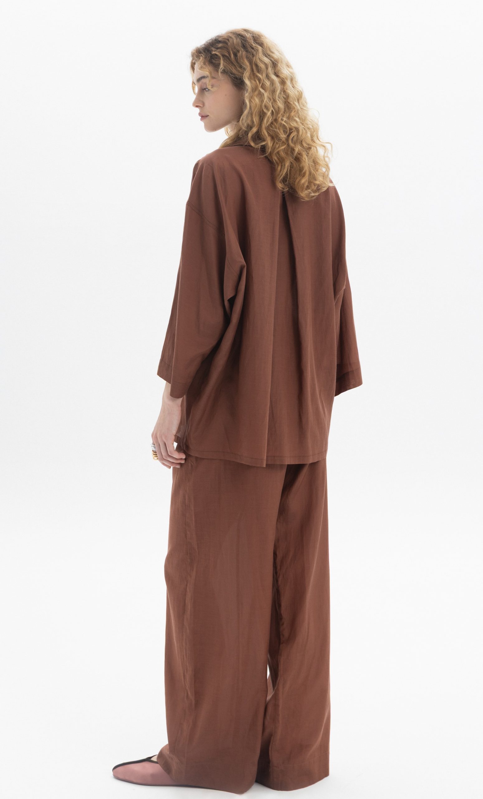 Το εμβληματικό σετ της Black & Black συνδυάζει την άνεση ενός pyjama look με την αίγλη ενός high-fashion outfit. Το oversized πουκάμισο με την απαλή υφή και η αέρινη παντελόνα δημιουργούν μια σιλουέτα που “ρέει” στο σώμα, προσφέροντας απόλυτη ελευθερία κινήσεων