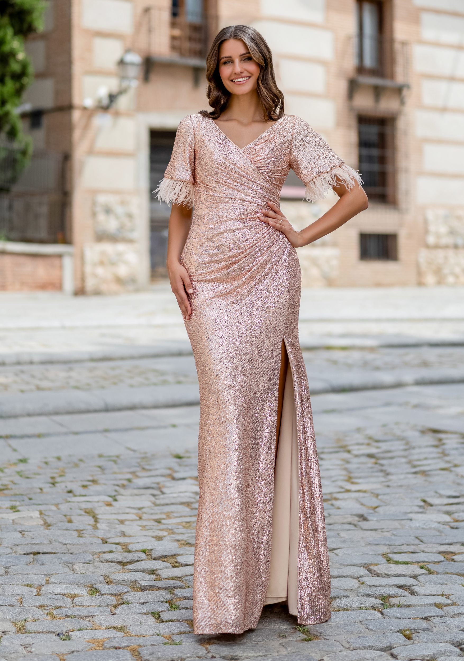 CHRISTIAN KOEHLERT SEQUINED JERSEY EVENING DRESS IN PINK WITH A FEATHER APPLIQUE 1130 . P