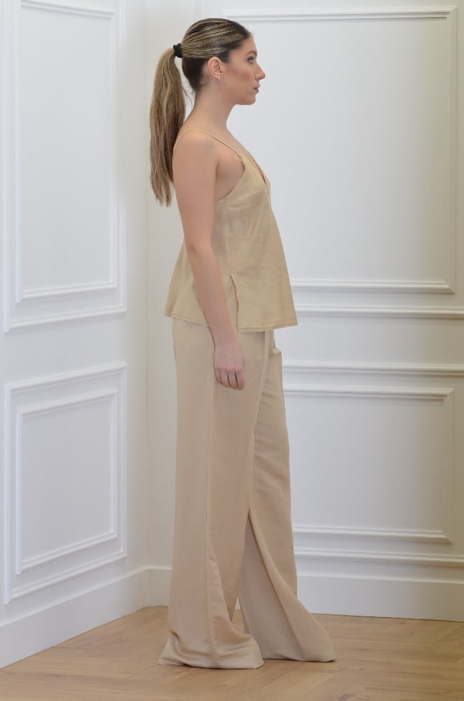 This must-have summer piece is a camisole linen top that instead of the classic lace detail Ckontova elevated it with a frayed in fringed style detail on its finish. It has a normal fit and can be perfectly combined with its matching pants.