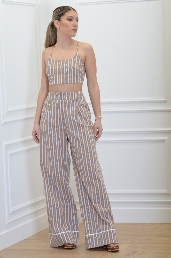These pants have a wide-leg line and a cuff detail. They have thin elegant stripes and are high-waisted for a flattering fit. Wear them with its matching crop top and shirt.