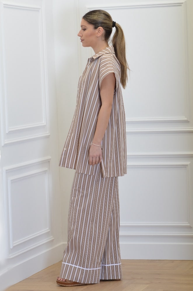 This is the piece you’re going to fall in love with this season. In loose line, thin, elegant stripes it has a back slit that closes with buttons, creating a flowy effect and making this piece even more stylish. Wear it with its matching striped pants for maximum style.