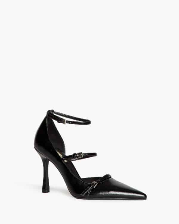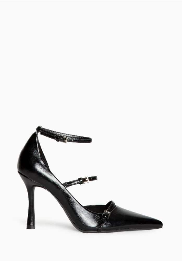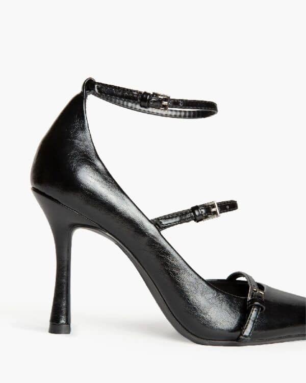 High-heeled pumps. Thin straps with buckles on the instep. Ankle strap closure with buckle on the outer side.