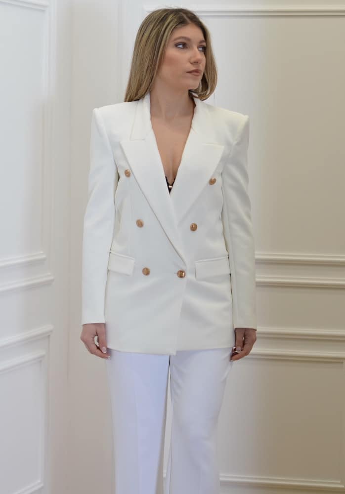 Double-breasted jacket in stretch crêpe. The blazer has peak lapels, long sleeves and patch flaps. The golden metal logo buttons provide a touch of light. Oversized fit. Part of the Essential collection, to create the perfect wardrobe.