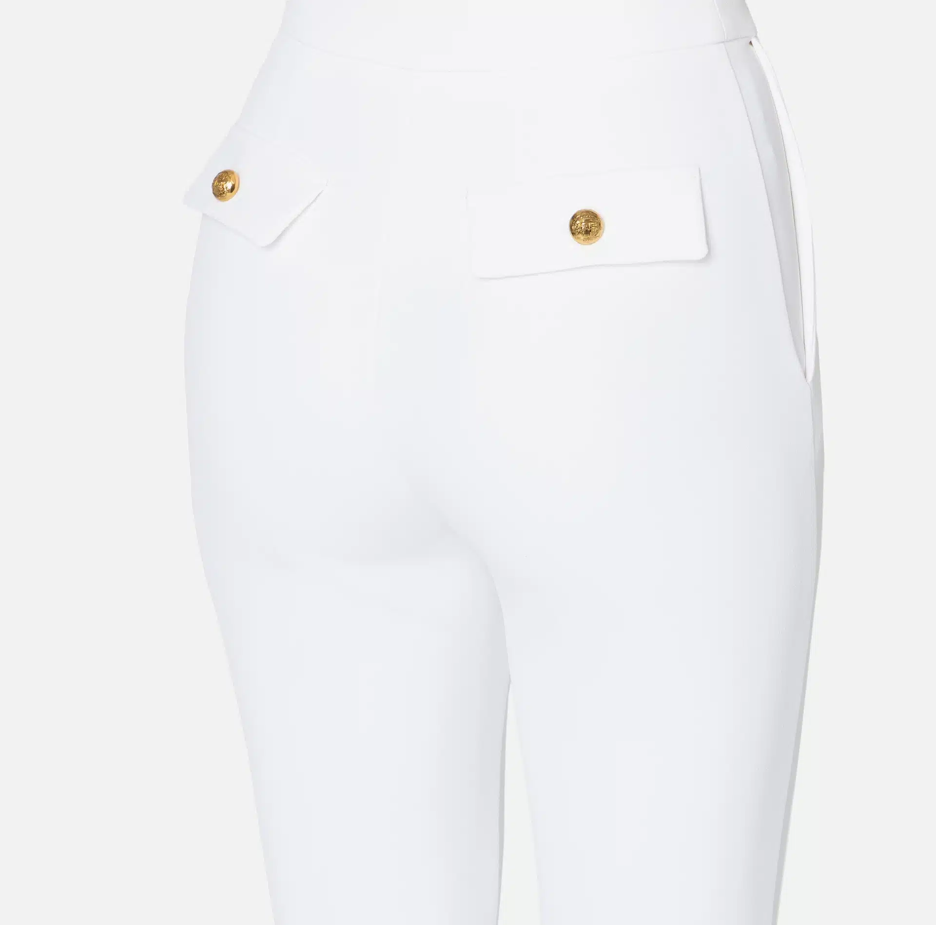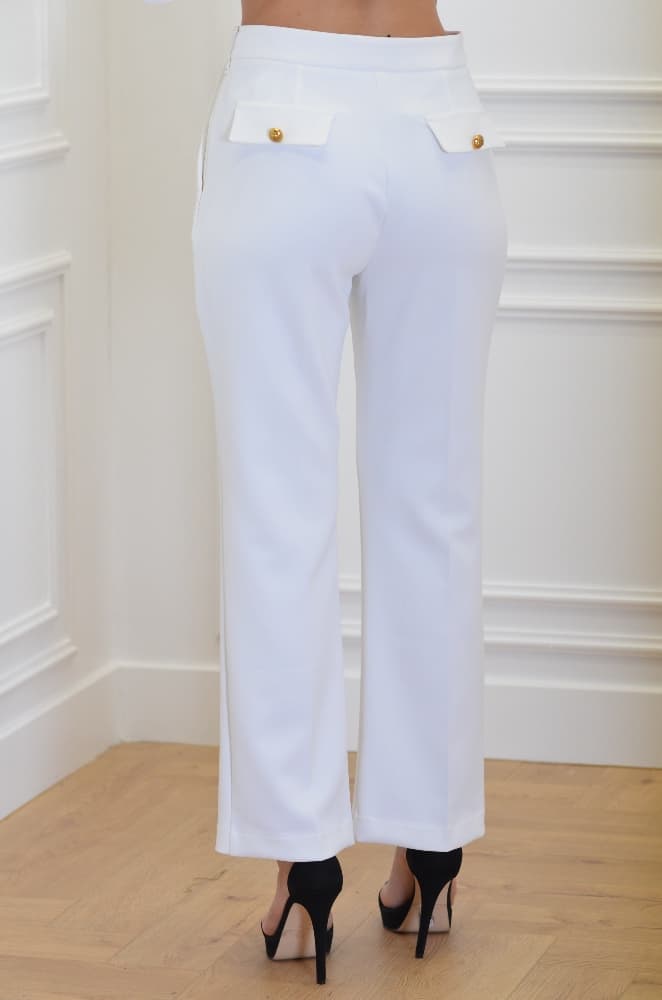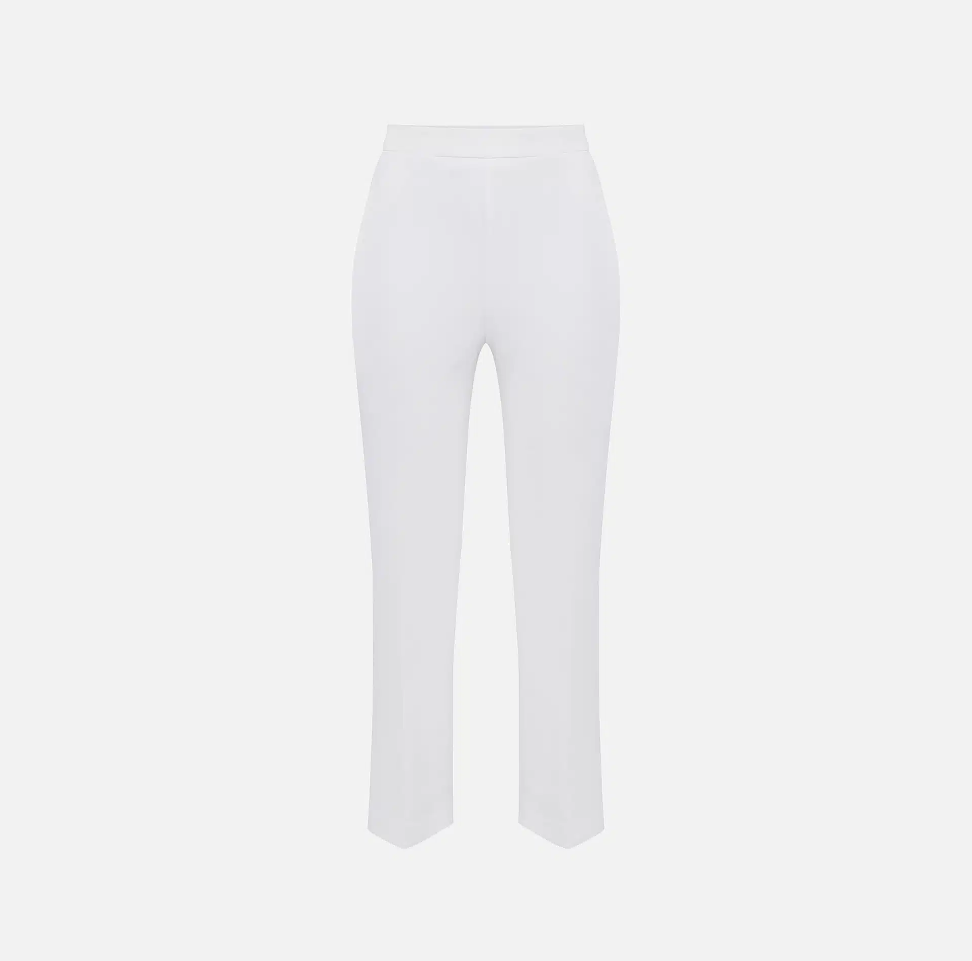 Stretch crêpe cropped trousers with slim fit and leg slightly flared at the bottom. They have slant pockets and a waistband embellished with a golden metal logo plaque. Flaps with buttons on the back. Part of the Essential collection, to create the perfect wardrobe.