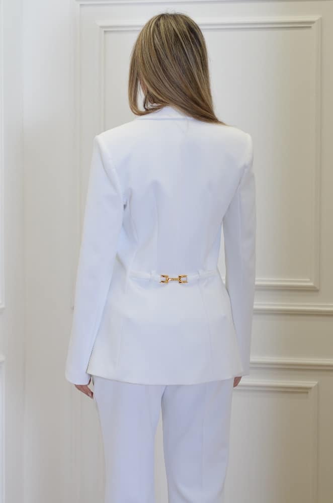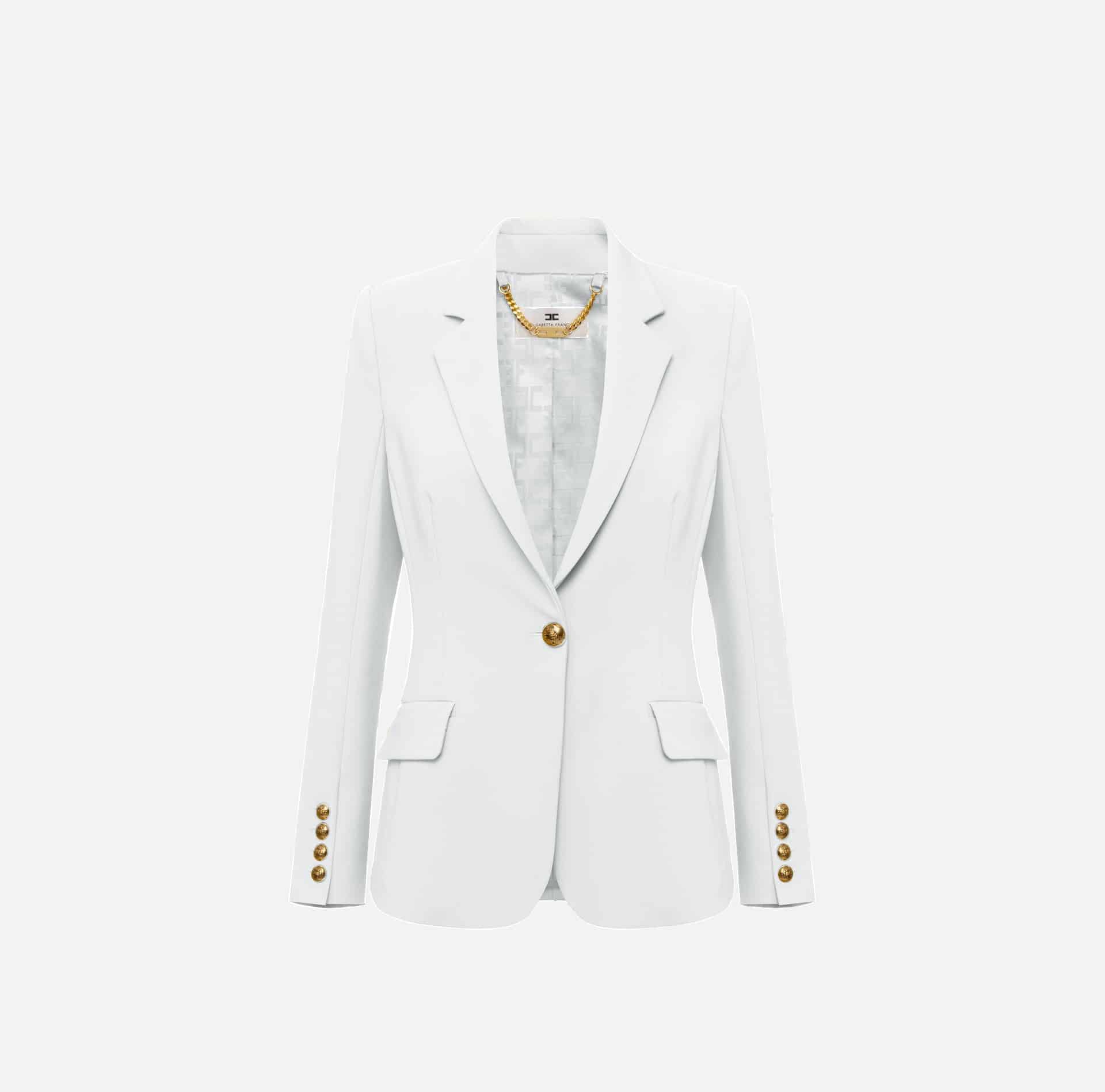 Single-breasted jacket in stretch crêpe. The blazer has lapels, sleeves with matching buttons and a breast pocket with embroidered logo. It is characterised by a back strap embellished with a golden metal logo interlocking buckle. Slim fit. Part of the Essential collection, to create the perfect wardrobe.