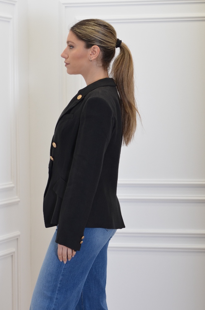 Linen-blend gabardine jacket. The blazer features peak lapels and patch flaps. Sophisticated and essential, with structured shoulders that give a linear and decisive silhouette. Golden metal buttons add a touch of light. Slim fit.