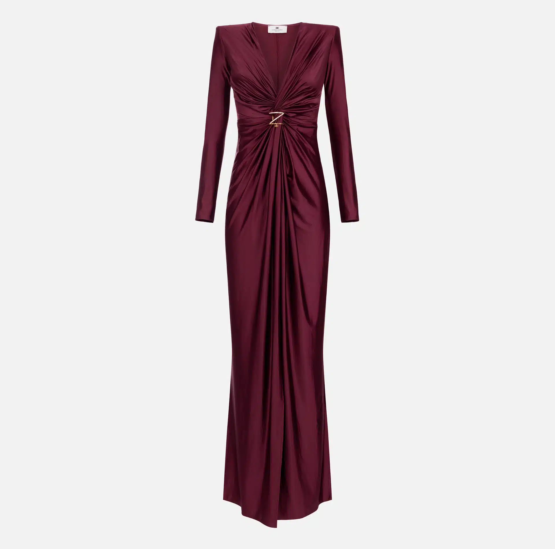ELISABETTA FRANCHI RED CARPET DRESS IN LYCRA WITH KNOT AND LOGO ACCESSORY