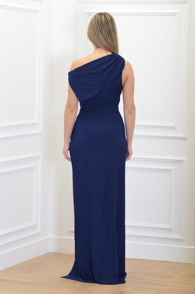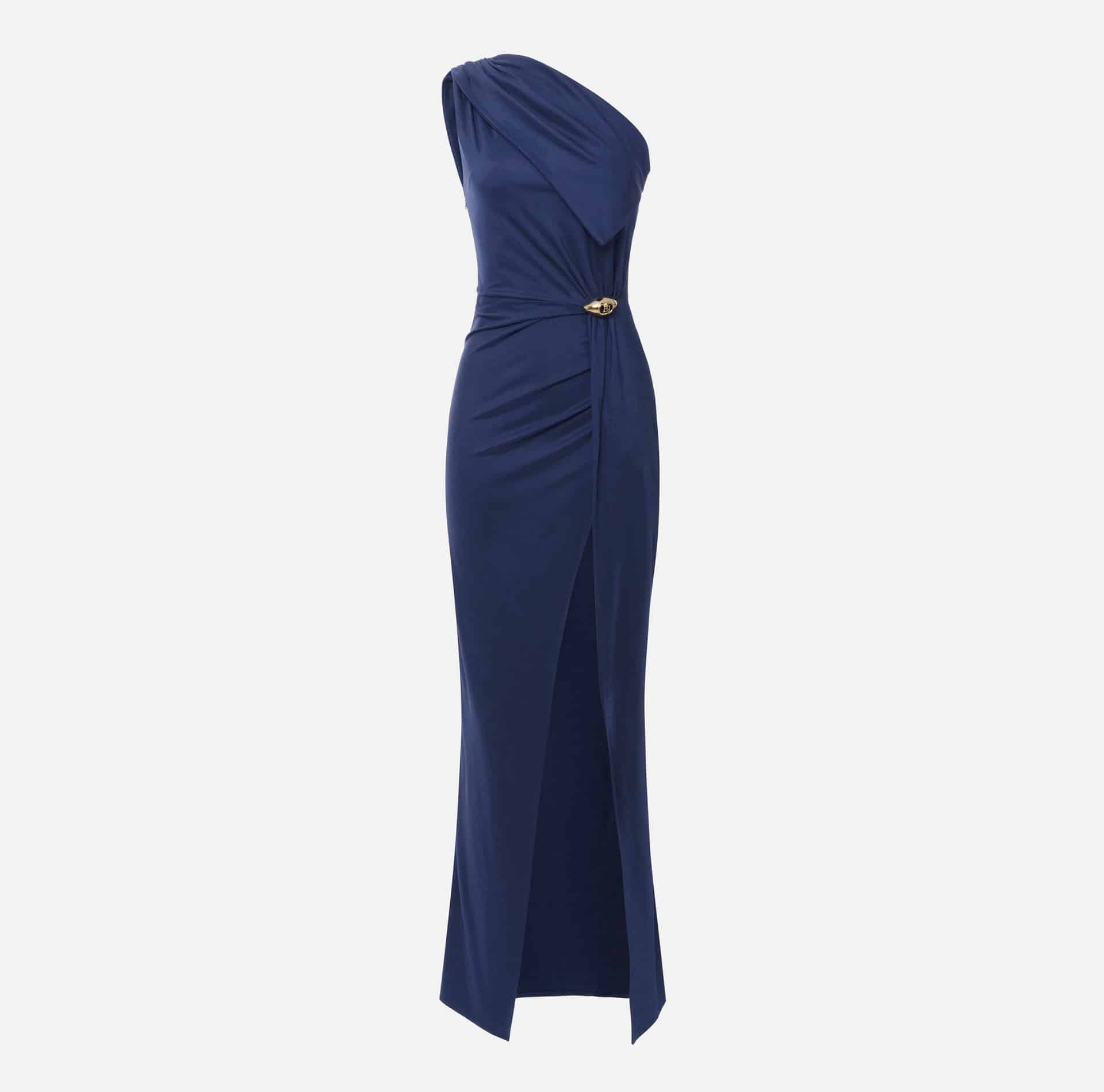 vening dress in flowing jersey. The dress has a wide asymmetrical neckline and high side slit. The central draping draws a sophisticated silhouette and is embellished with an oval jewelled decoration with a coloured stone inside.