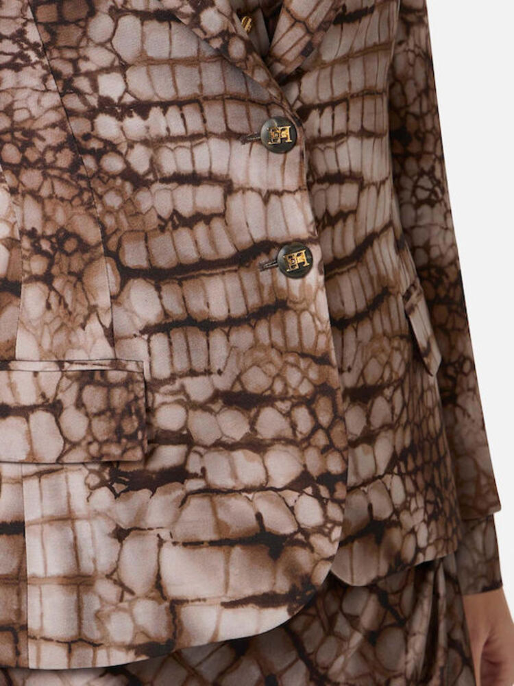Eντυπωσιακό animal print σε αποχρώσεις καφέ και μπεζ που χαρίζει δυναμικό και σύγχρονο στυλ. Διαθέτει κλασικό γιακά με πέτο, μακριά μανίκια και κλείσιμο με κουμπιά στο μπροστινό μέρος, ενώ η εφαρμογή του αγκαλιάζει τη σιλουέτα δημιουργώντας ένα θηλυκό και κομψό αποτέλεσμα.