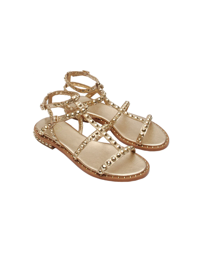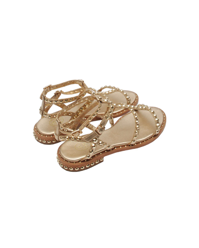 Ash sandals with platinum leather upper with tone on tone round studs. Round toeline. Buckles closure. Leather lining. 2 cm heel. Leather outsole. Ash Spring/Summer women’s collection.