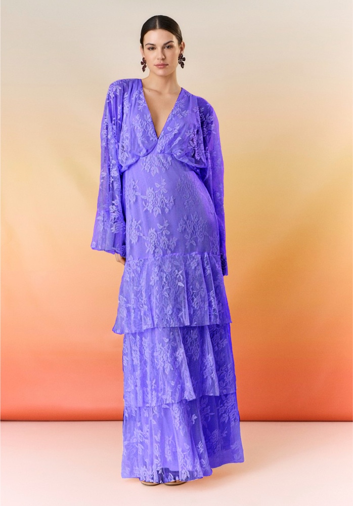 Μάξι φόρεμα με δαντέλα και μακριά μανίκια. Διαθέτει φόδρα σε όλο το μήκος.