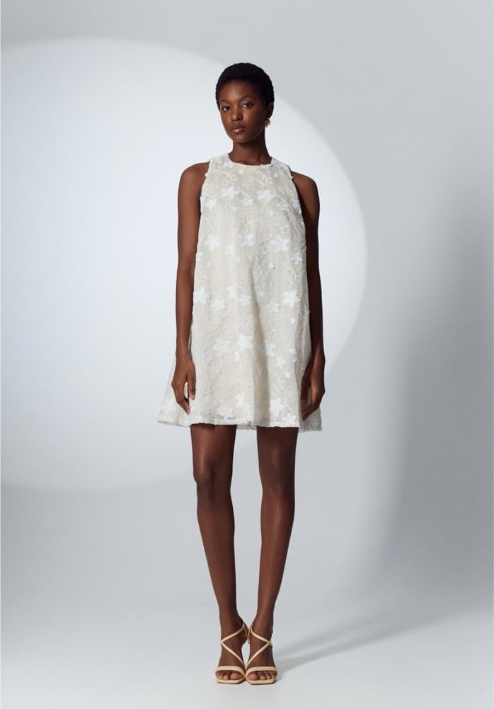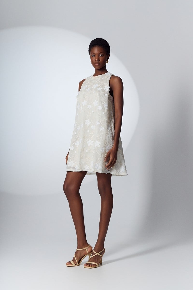 Αμάνικο μίνι φόρεμα διακοσμημένο με λουλούδια και κούμπωμα με κουμπί στον λαιμό.