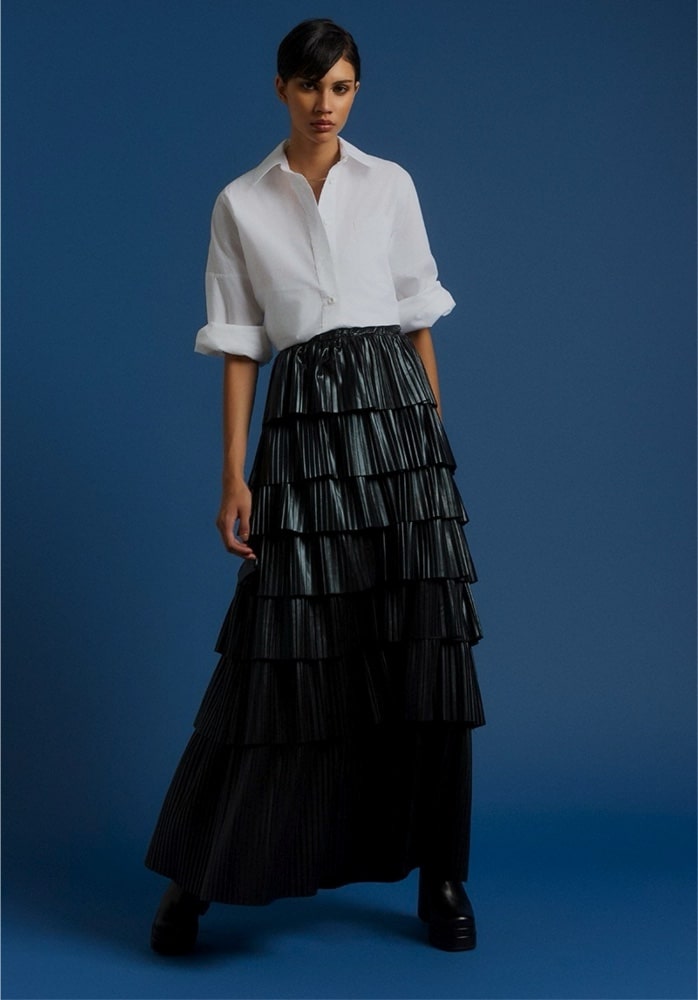 Μάξι δερματίνη φούστα με βολάν και λάστιχο στη μέση.