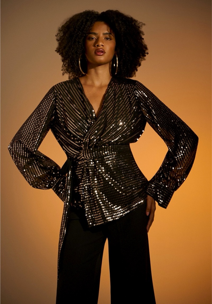 Αυτή η εντυπωσιακή κρουαζέ μπλούζα από μουσελίνα με παγιέτες διαθέτει μανίκια που κουμπώνουν με κουμπιά. Το δέσιμο στη μέση αναδεικνύει τη σιλουέτα με μοναδικό τρόπο.