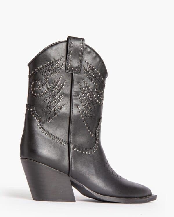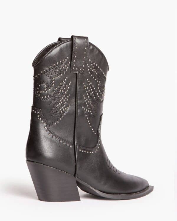 Cowboy style ankle boot. Shaft and toe with embroidered details. Studs on the shaft and on the straps. Pointed toe. Zip on the inside side.
