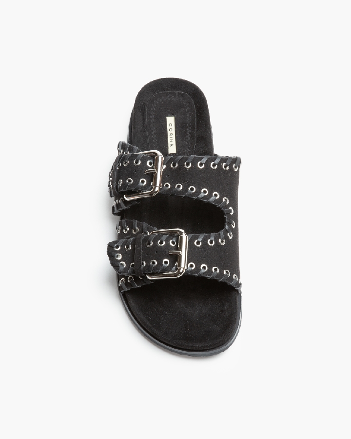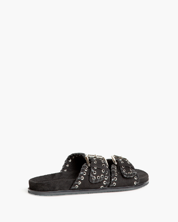 Flat sandal with wide straps and buckle and eyelet detailing. Ergonomic insole.