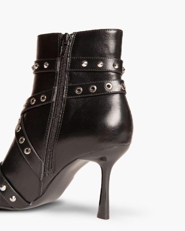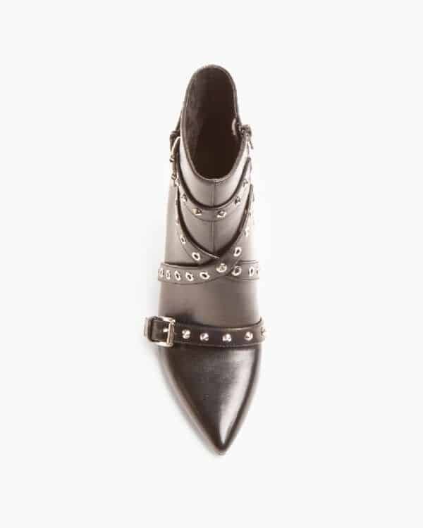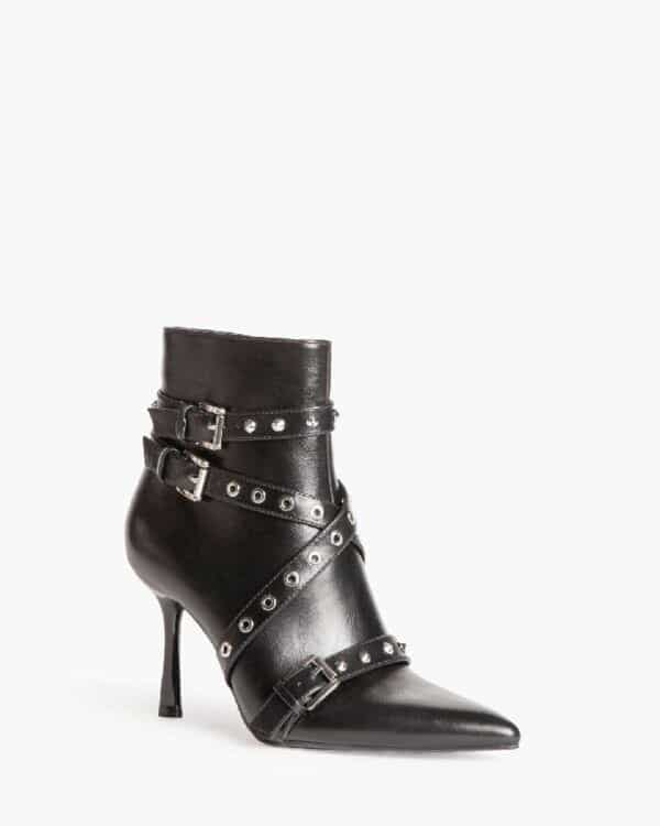 High-heeled boot. Tight shaft and buckle and stud detail. Zipper on the inside side. Thin heel. Pointed toe.