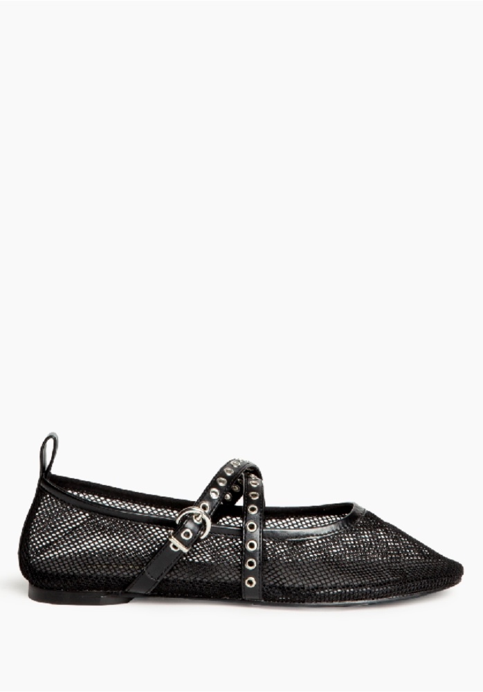 Mary Jane-style flats in sheer mesh. Round toe. Eyelet and buckle detailing on the front straps.