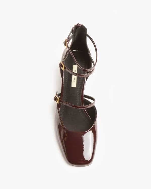 Mary Jane style mid-heeled ballerina flat. Thin straps with buckles on the instep. Ankle strap with buckle. Zip fastening at the back.
