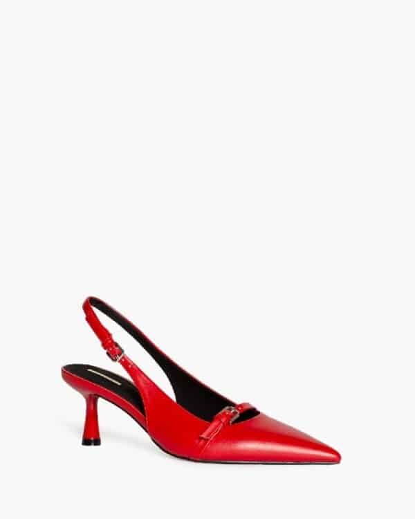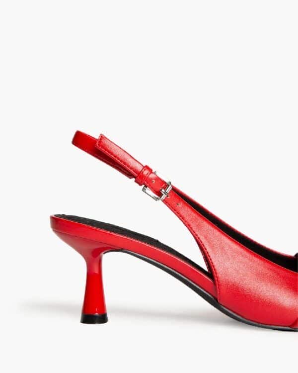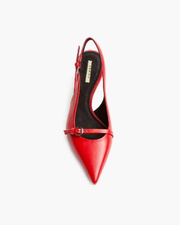Slingback court shoe. Pointed toe. Thin strap detail with buckle at the front. Back strap with buckle.