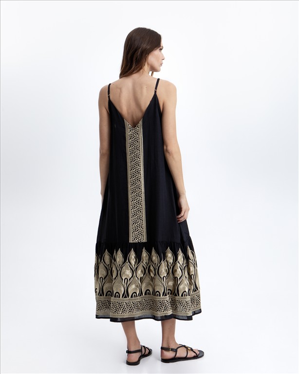 - Σε κλασική μαύρη βάση με χρυσές λεπτομέρειες, δημιουργεί μια έντονη αλλά εκλεπτυσμένη αντίθεση που τραβάει τα βλέμματα. Οι λεπτές τιράντες προσδίδουν θηλυκότητα και ελαφρότητα, ενώ η μακριά, ρέουσα γραμμή του φορέματος αγκαλιάζει όμορφα τη σιλουέτα, προσφέροντας κομψή κίνηση σε κάθε βήμα.