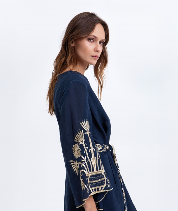 - Μίνι φόρεμα σε Α γραμμή που τονίζεται περαιτέρω από τη V λαιμόκοψη και τα φαρδιά μανίκια με εμπνευσμένο κέντημα στο τελείωμα με αναφορές σε κλασικά αγγεία και φυτικά μοτίβα.