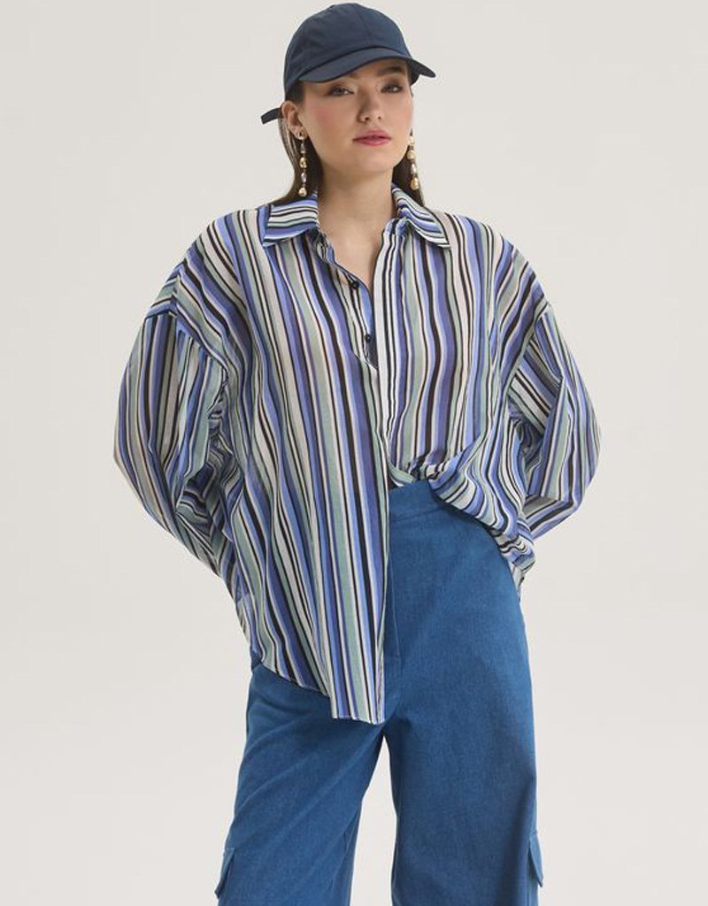 - Άνετο oversized πουκάμισο με κάθετες ρίγες σε μπλε και ουδέτερους τόνους που χαρίζει μοντέρνο και δυναμικό ύφος