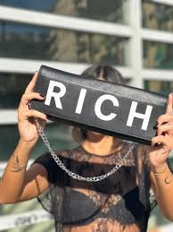 Features a strap and chain in silver color to be worn on the shoulder or hand-held.