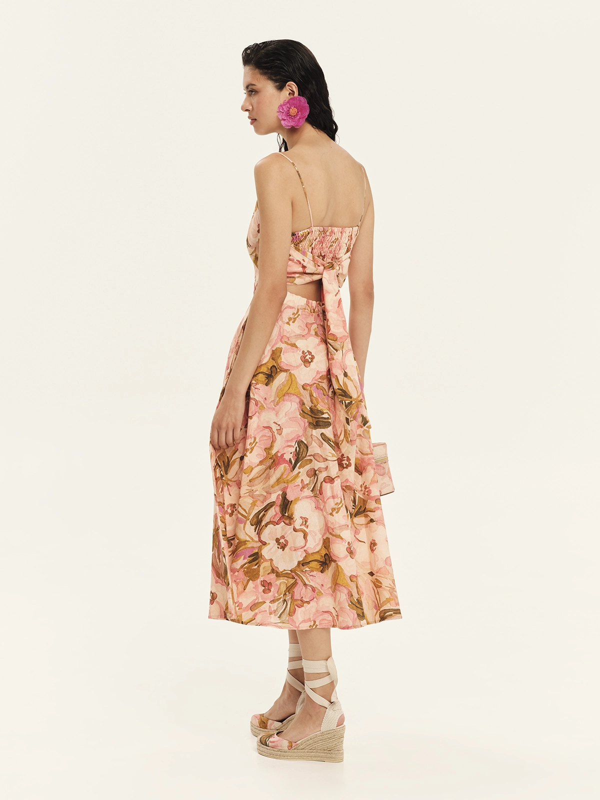 - Kourbela midi φόρεμα κατασκευασμένο από μείγμα λινό με floral print, με λεπτές τιράντες και δεσίματα στην πλάτη. Διαθέτει ελαστική, σφηκοφωλιά στο πίσω μέρος και ελαστική μέση για άνετη, προσαρμόσιμη εφαρμογή. Η φούστα εμπνεύστηκε από σιλουέτα της δεκαετίας του 1950, δημιουργώντας μια θηλυκή και ισορροπημένη γραμμή, ενώ οι πλαϊνές τσέπες προσθέτουν μια πρακτική πινελιά. Ένα φόρεμα που συνδυάζει διαχρονική κομψότητα με σύγχρονη αισθητική — ιδανικό για καθημερινές και κομψές εμφανίσεις.