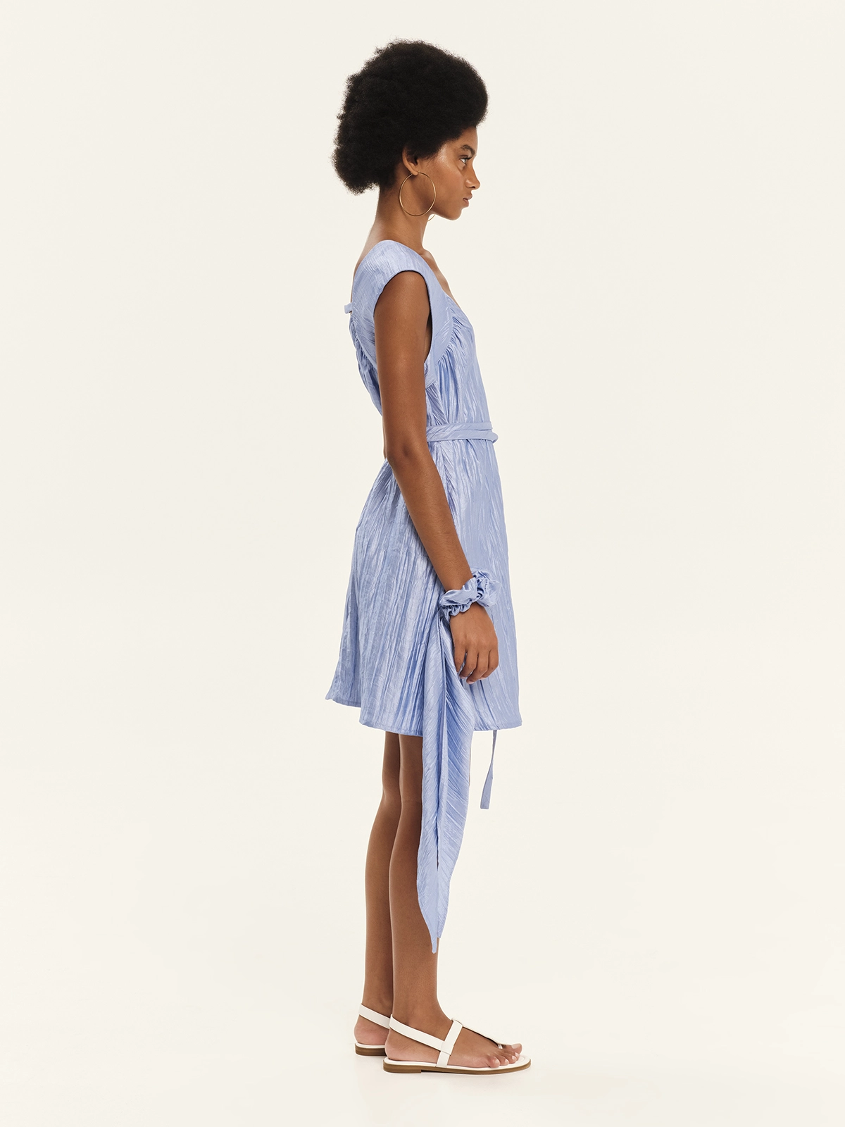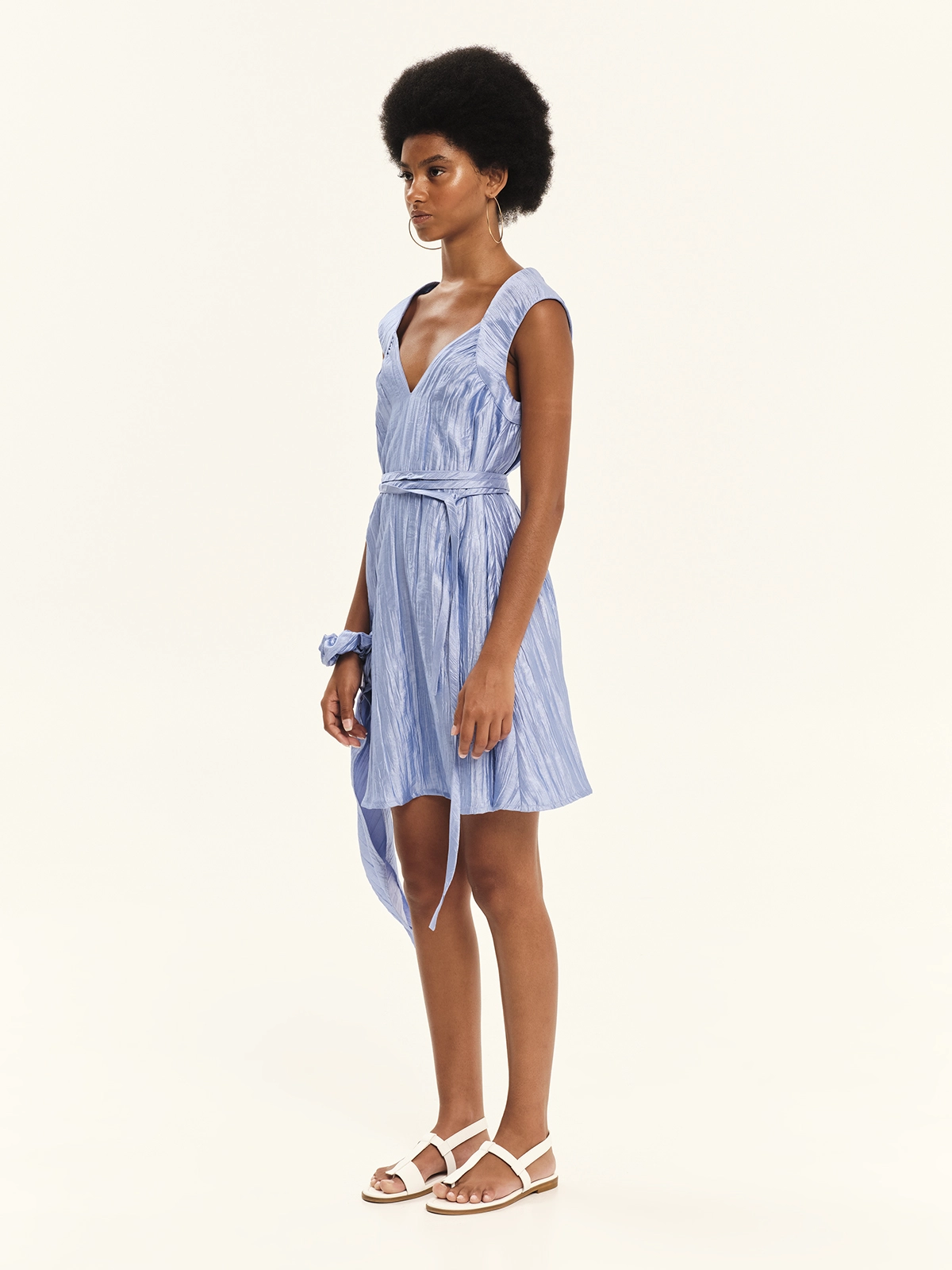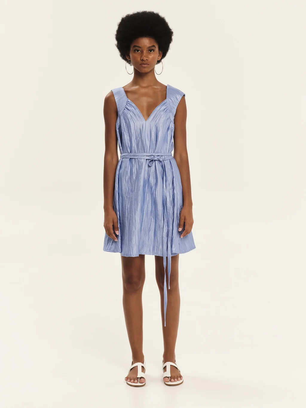 - Kourbela μίνι φόρεμα σιέλ χωρίς μανίκια με V-λαιμόκοψη, κατασκευασμένο από ζαρωτό ύφασμα rayon με ιριδίζουσα λάμψη. Σχεδιασμένο με ξεχωριστές τιράντες που αγκαλιάζουν απαλά τους ώμους, η χαλαρή του σιλουέτα αγκαλιάζει απαλά το σώμα. Διαθέτει λεπτές ζώνες στη μέση που μπορούν να δένονται για να τονίσουν τη μέση. Ένα πραγματικό κοκτέιλ statement κομμάτι, ιδανικό για εντυπωσιακές και κομψές εμφανίσεις.