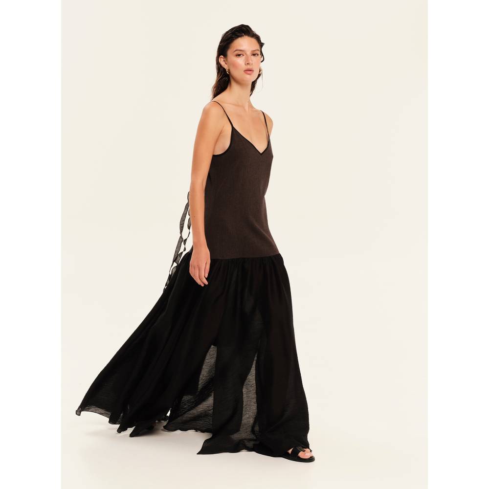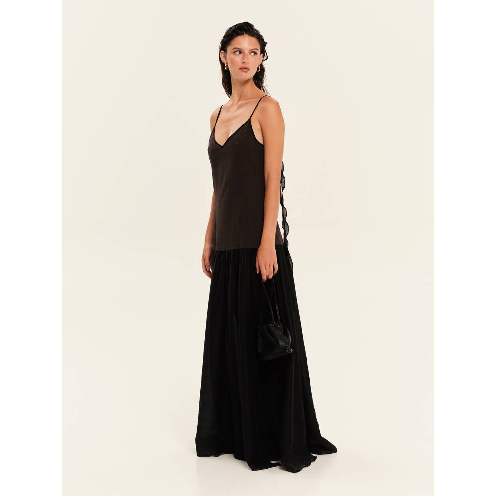 - Πρόκειται για ένα κομψό μάξι φόρεμα (maxi dress) σε μαύρο χρώμα, το οποίο συνδυάζει τη μίνιμαλ αισθητική με μια ιδιαίτερη δομή. Το φόρεμα διαθέτει χαμηλωμένη μέση (dropped waist), που δημιουργεί έναν ενδιαφέροντα διαχωρισμό ανάμεσα στο εφαρμοστό επάνω μέρος και την πλούσια φούστα. Διαθέτει λαιμόκοψη V-neck και εξαιρετικά λεπτές τιράντες, αφήνοντας ακάλυπτο το στέρνο και τους ώμους για μια εκλεπτυσμένη εμφάνιση.