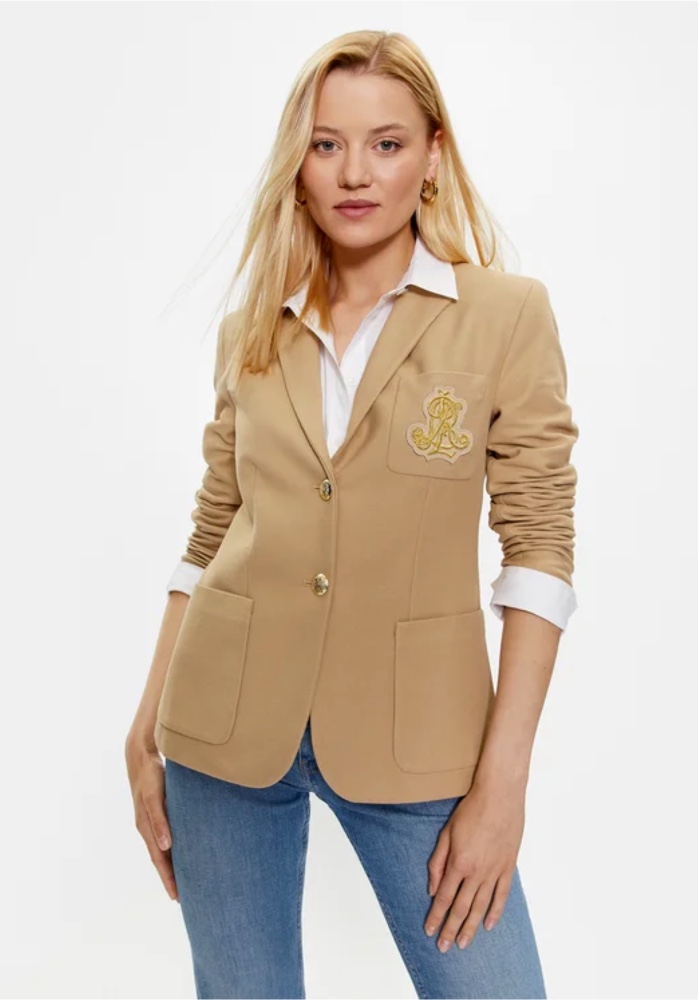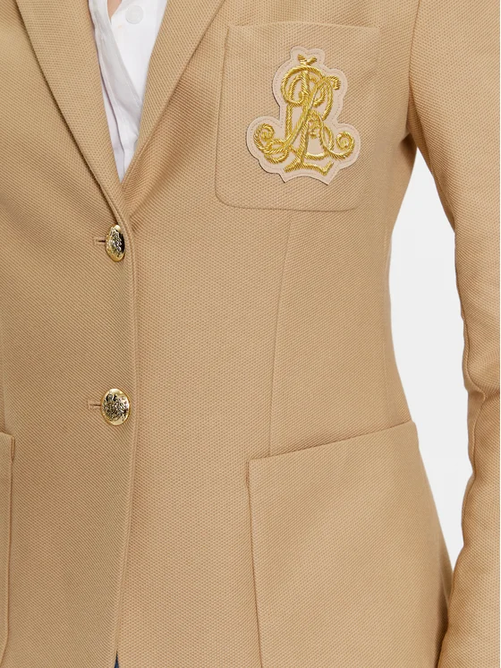 - Long sleeves with four-button cuffs. Left chest patch pocket. Two front waist patch pockets. Crest-embossed buttons. Bullion “LRL” patch embroidered on the left chest. Fully lined.