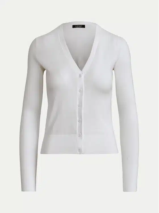- V-neck. Open front. Six-button placket with silver-tone “LRL”-engraved buttons.