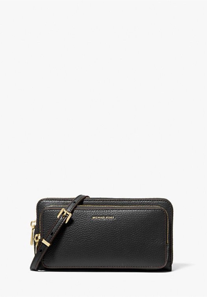 Streamlined yet spacious, our Jet Set continental crossbody bag is crafted from pebbled leather with gold-tone hardware for sophisticated appeal. This large-sized style features a sleek rectangular silhouette with organized compartments to keep your essentials secure and a removable adjustable strap for versatile carrying options. Wear it crossbody for hands-free convenience or carry it as a clutch for polished evening style.