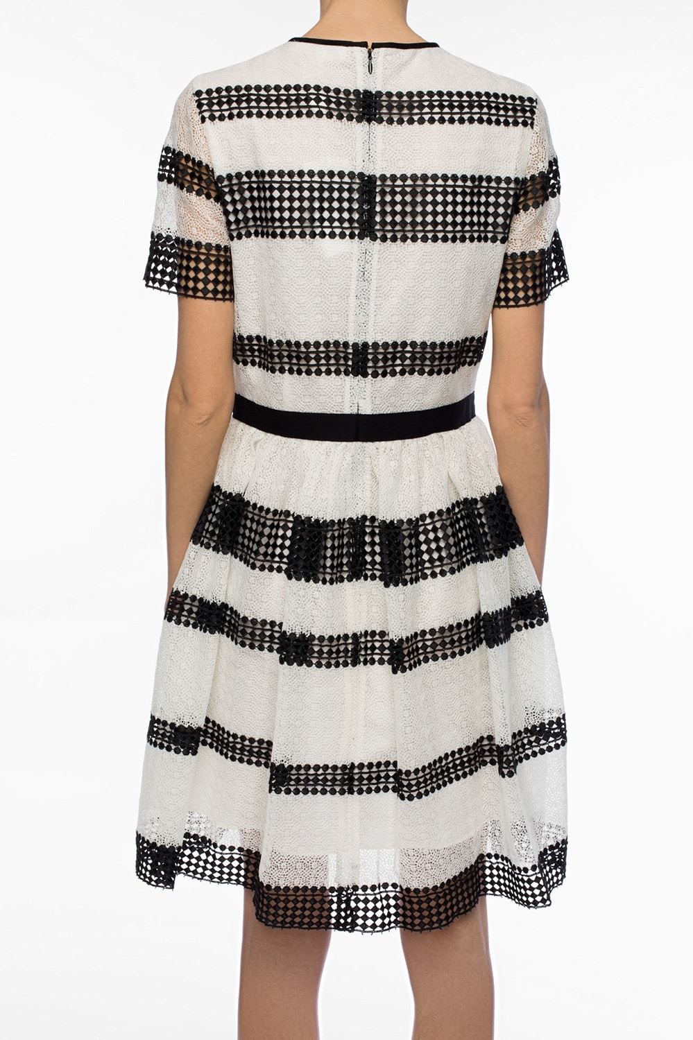 White and black flared lace dress with short sleeves from Michael Michael Kors. Round neck with a back zip fastening. Decorated with stripes. Black grosgrain strap at the waist