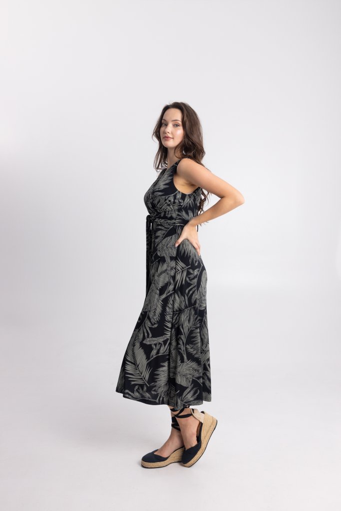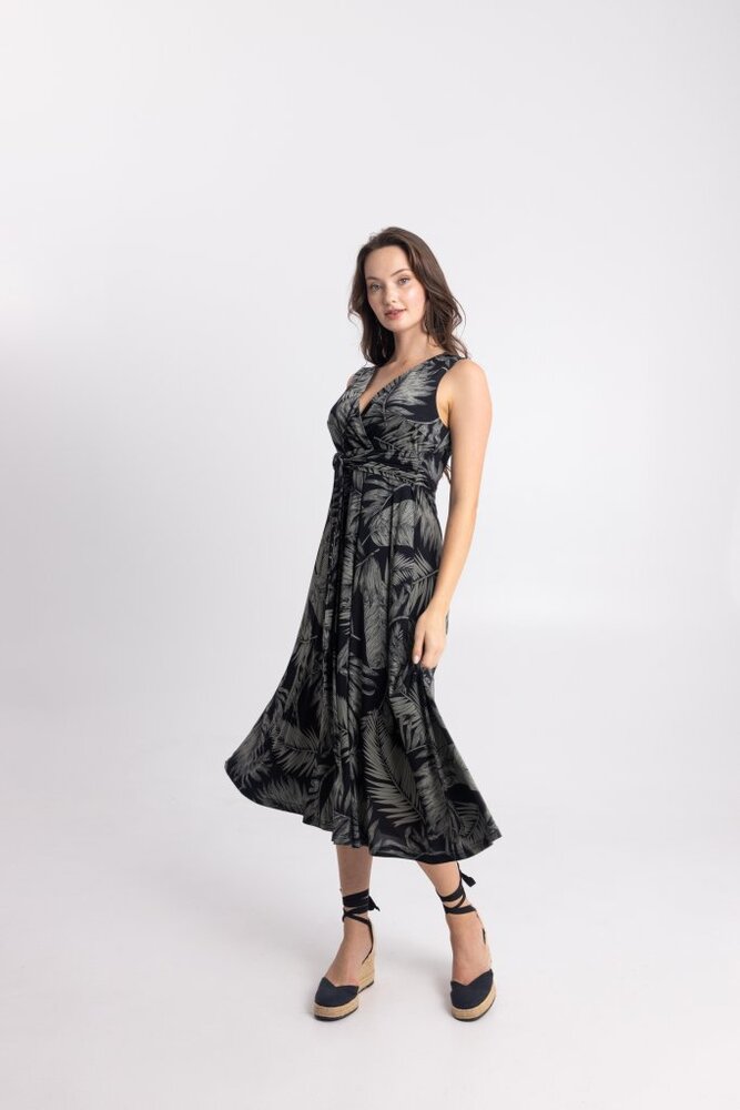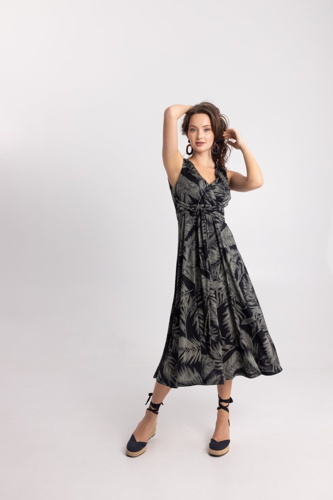 - Open Fashion Κομψό γυναικείο midi φόρεμα με ιδιαίτερο tropical print σε, μαύρο0 που χαρίζει μοντέρνο και ταυτόχρονα διαχρονικό χαρακτήρα. Το εντυπωσιακό μοτίβο δημιουργεί ένα ξεχωριστό αποτέλεσμα, ιδανικό για γυναίκες που θέλουν να ξεφεύγουν από τα κλασικά σχέδια χωρίς να χάνουν την κομψότητά τους.