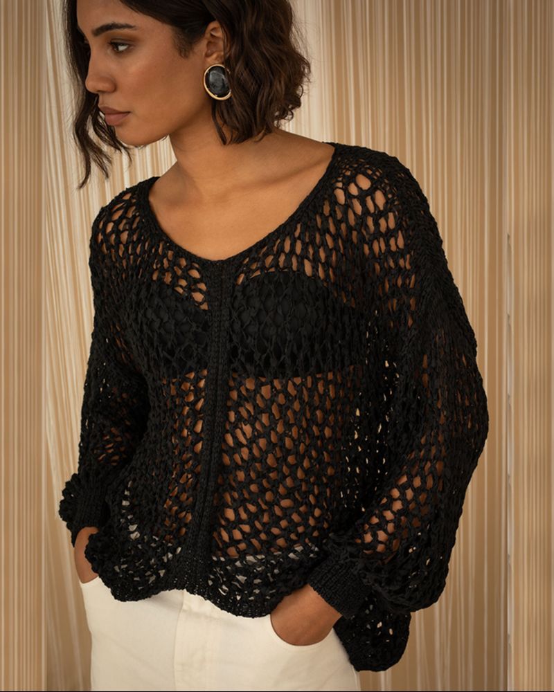 - Philia Loft Διάτρητη μπλούζα με μανίκι σε μαύρο χρώμα και χαλαρή oversize γραμμή.
