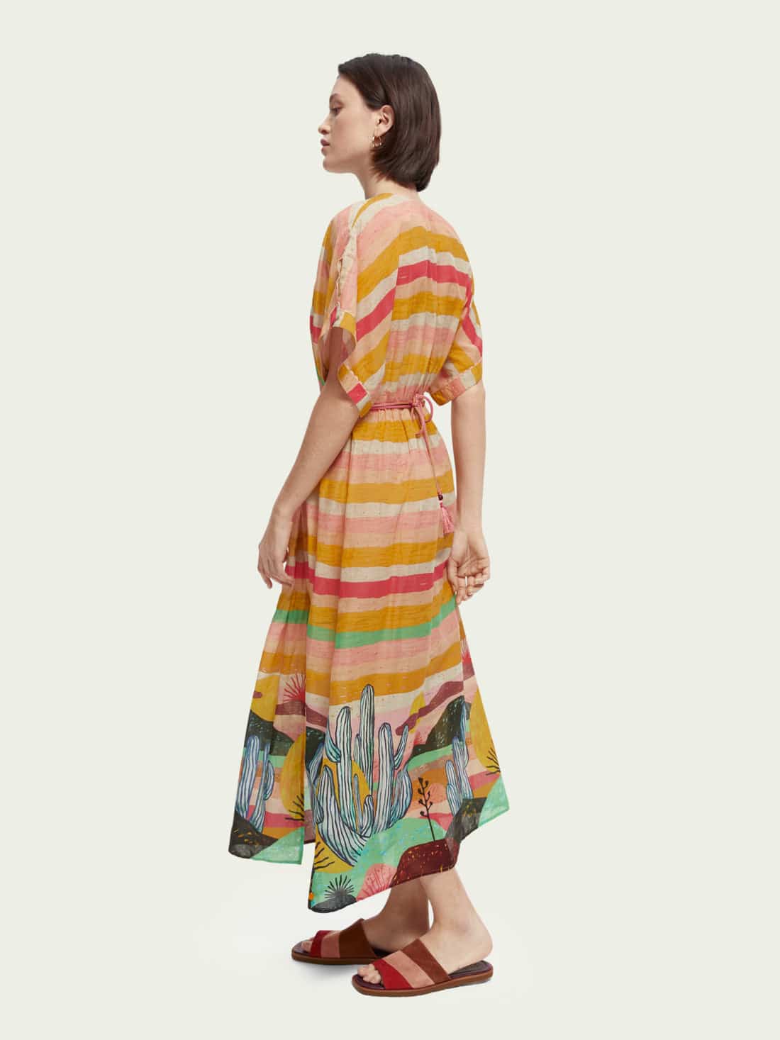 From the Abel Macias capsule, this unlined beach kaftan dress features a desert-inspired stripe and print.