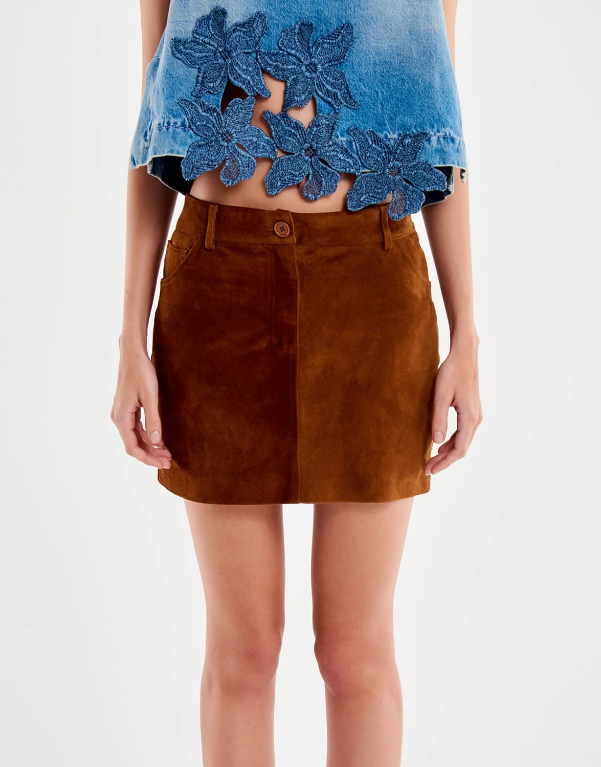High-waisted leather mini skirt. Front zip and button closure. Belt loops. Back patch pockets.