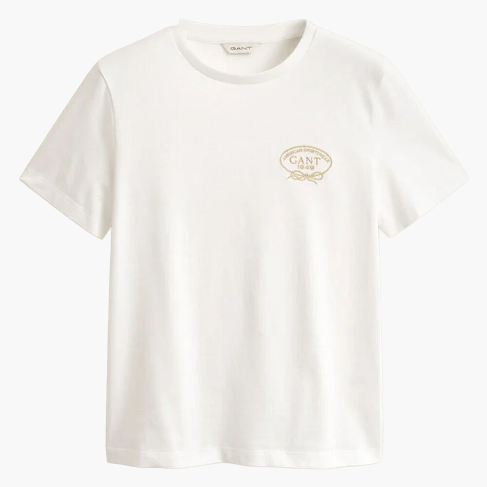 - Σε κομψό χρώμα eggshell (υπόλευκο) αποτελεί μια διαχρονική επιλογή για καθημερινές εμφανίσεις. Κατασκευασμένο από απαλό βαμβάκι, προσφέρει άνετη εφαρμογή και ευχάριστη αίσθηση όλη την ημέρα. Διαθέτει κλασική στρογγυλή λαιμόκοψη και διακριτικό λογότυπο GANT στο στήθος που χαρίζει κομψό και minimal χαρακτήρα. Συνδυάζεται εύκολα με jeans, παντελόνια ή φούστες για ένα casual αλλά προσεγμένο look.