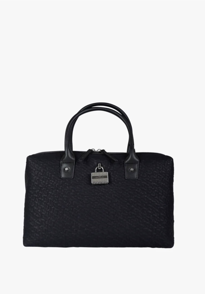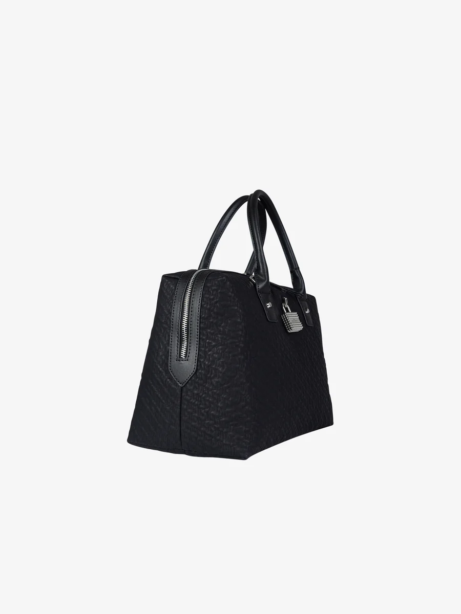 Details: Handbag with a geometric line and rigid structure, featuring double handles and a discreet front logo. An essential and roomy accessory, perfect for everyday use with a sophisticated touch.