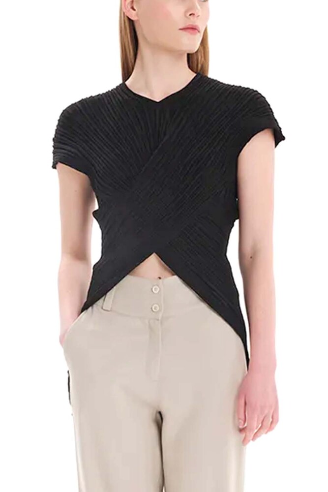 - Kourbela μαύρο πλεκτό κρουαζέ τοπ με ασύμμετρο σχεδιασμό και κοντά μανίκια, κατασκευασμένο από ελαστικό νήμα βισκόζης. Διαθέτει ελαστική ριπ πλέξη και άνετη εφαρμογή που αγκαλιάζει απαλά το σώμα, δημιουργώντας ασυμμετρία στο τελείωμα. Συνδυάζεται ιδανικά με τα κάτω μέρη της συλλογής, προσφέροντας κομψά καλοκαιρινά σύνολα.