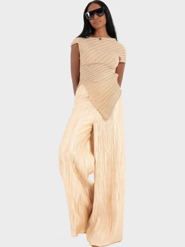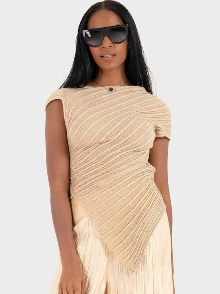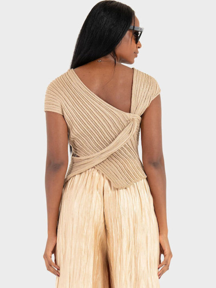 - Kourbela ασύμμετρο πλεκτό τοπ μπεζ-χρυσο κατασκευασμένο από νήμα βισκόζης με λούρεξ, με διακριτική διάτρητη πλέξη. Διαθέτει ψηλό λαιμό και εντυπωσιακή ανοιχτή πλάτη, ισορροπώντας τον μινιμαλιστικό σχεδιασμό με εντυπωσιακές λεπτομέρειες. Ελαφρύ και άνετο, αποτελεί την τέλεια επιλογή για κομψές βραδινές εμφανίσεις και μοντέρνα, φωτεινά looks.