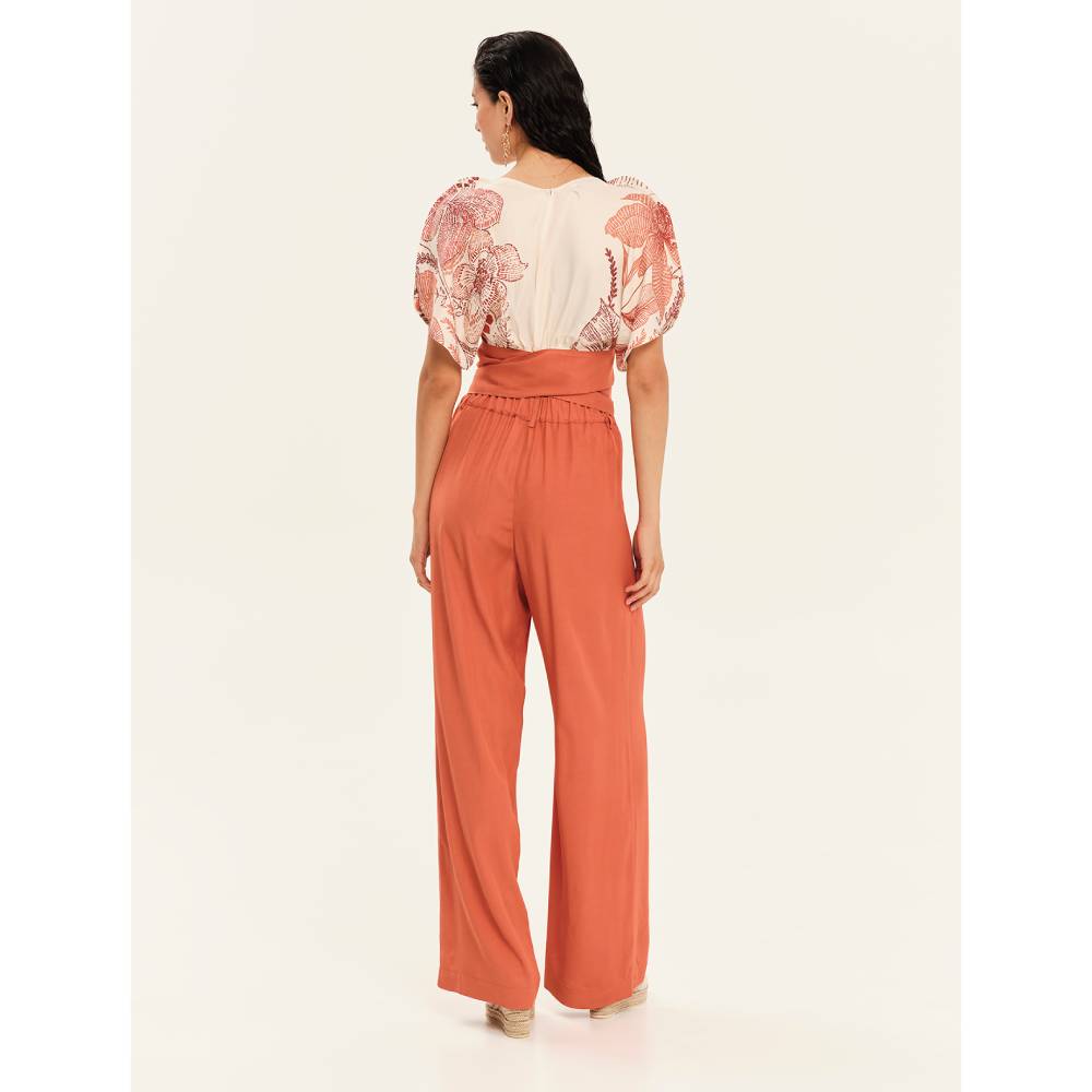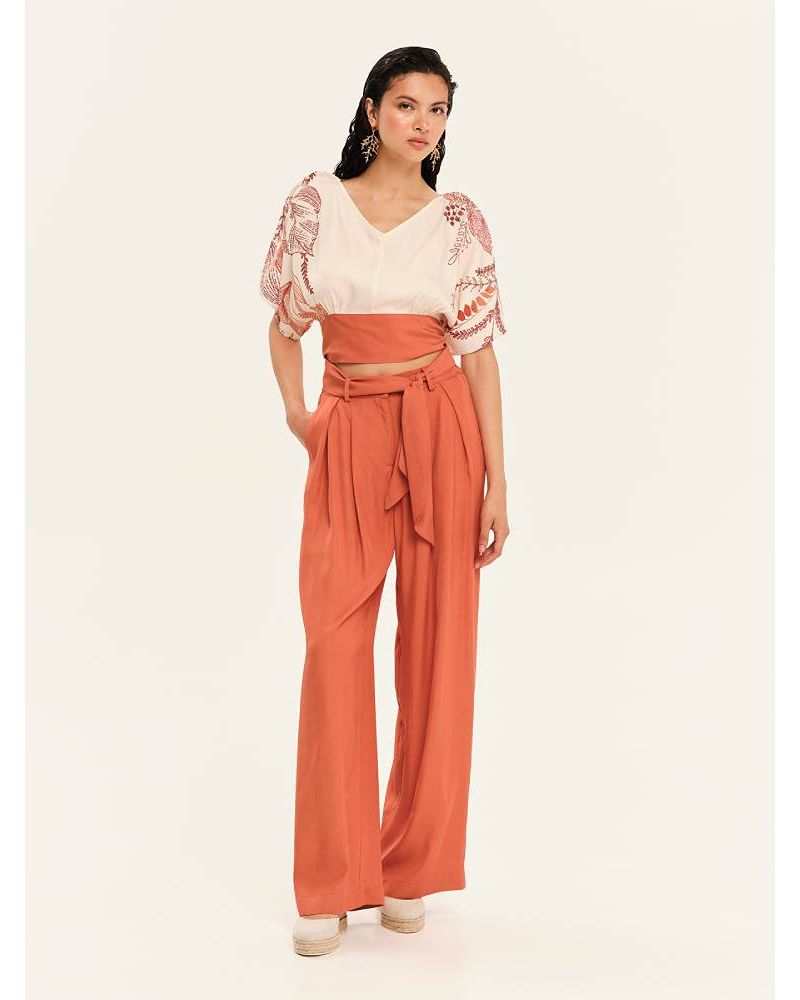 - Kourbela top που διαθέτει λαιμόκοψη V (V-neck) που κολακεύει το στήθος και φαρδιά, φουσκωτά μανίκια (puff sleeves) με κεντητές λεπτομέρειες σε κεραμιδί/πορτοκαλί αποχρώσεις. Το κάτω μέρος καταλήγει σε μια φαρδιά, σταυρωτή φάσα τύπου κασέ-κέρ (cache-coeur) που δένει στη μέση, τονίζοντας τη σιλουέτα.