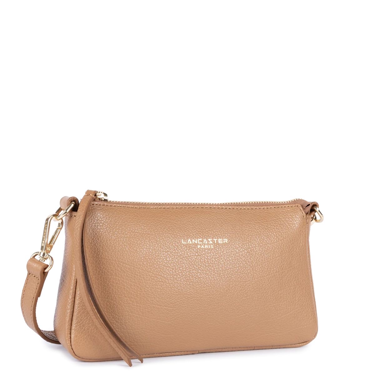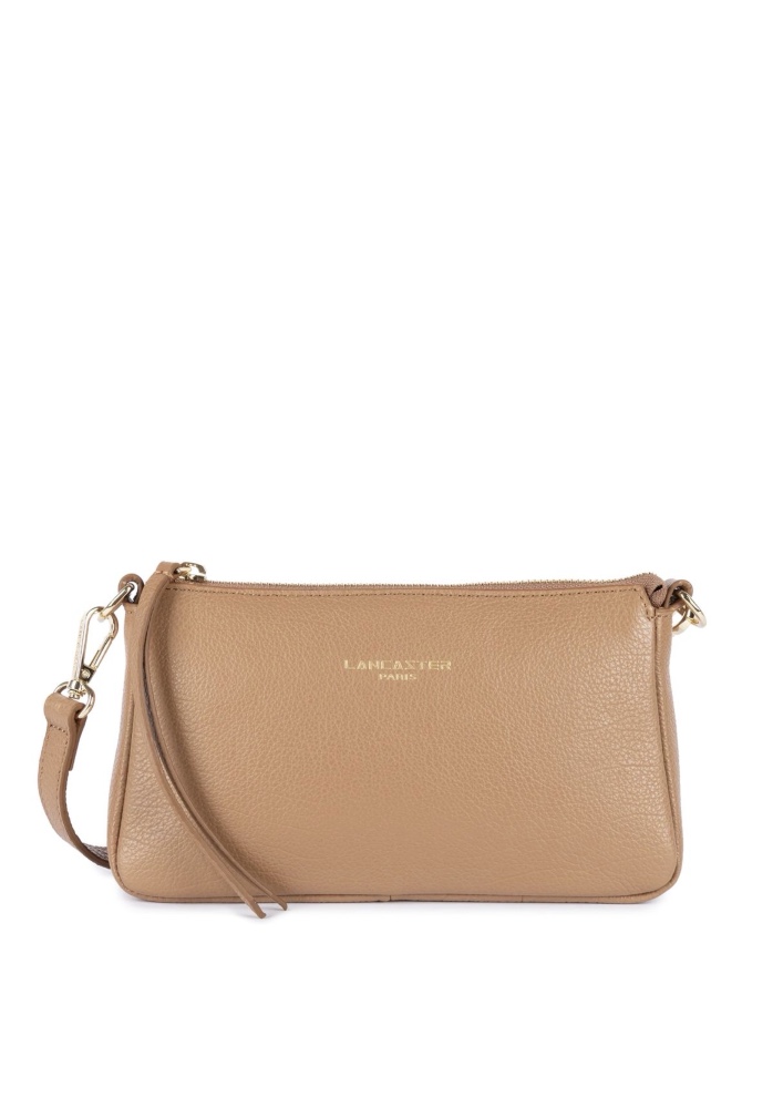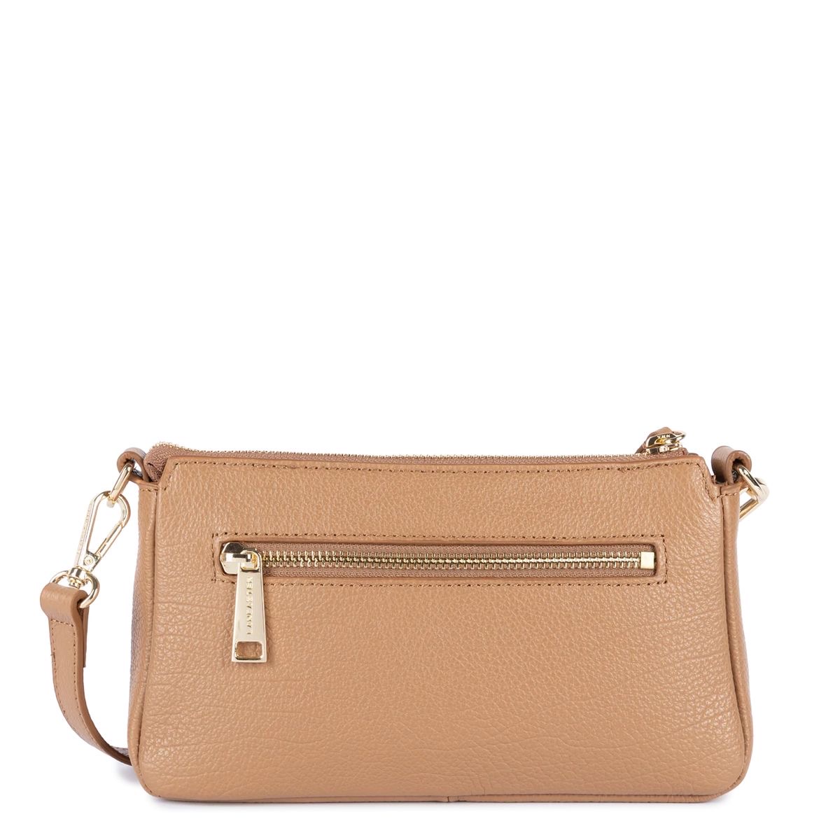 This clutch is crafted from grained cowhide leather. It features a rear exterior zippered pocket, a simple interior pocket, and a zippered interior pocket. It can be worn over the shoulder or crossbody.