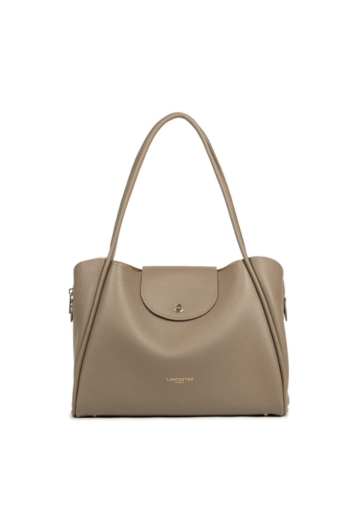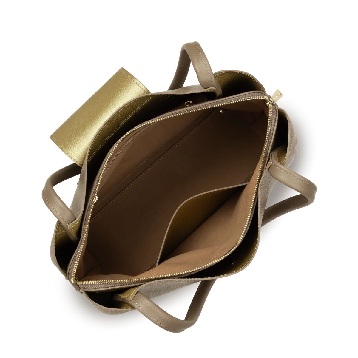 This tote bag is crafted from grained cowhide leather. It features a zippered divider, three simple interior pockets, and one zippered interior pocket. It can be worn over the shoulder or crossbody.